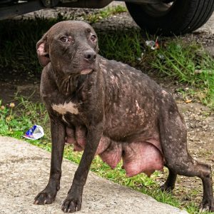 When she slowly crossed the scorching asphalt of the New Orleans supermarket parking lot, every single rib on the mother dog’s body was painfully visible against her…
