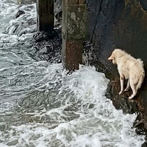 The freezing, churning ocean water crashed violently against the jagged rocks, repeatedly swallowing the small, trembling silhouette of a white dog named Yt. He stood completely paralyzed…