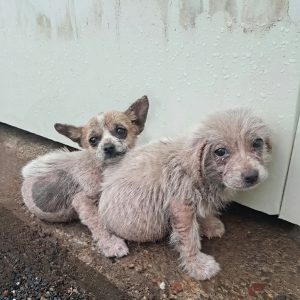 Huddled in the Freezing Rain, Two Hairless Puppies Refused to Leave Without Their Mother