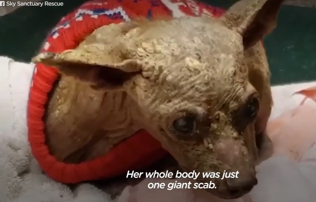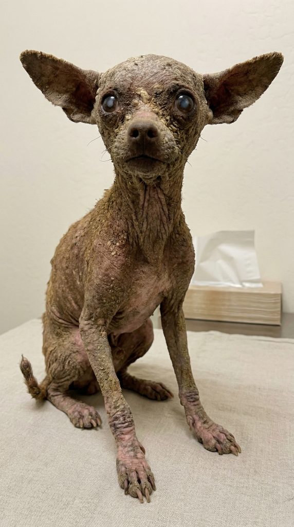 When Nandi was first discovered, her appearance broke the hearts of everyone who saw her. There was no soft fur. No wagging tail. Her entire body looked as though it had been turned to stone. She was covered head to paw in what looked like one giant, painful scab. Her skin was raw, tight, and unforgiving.