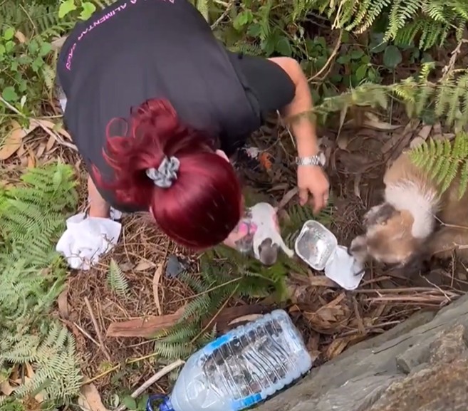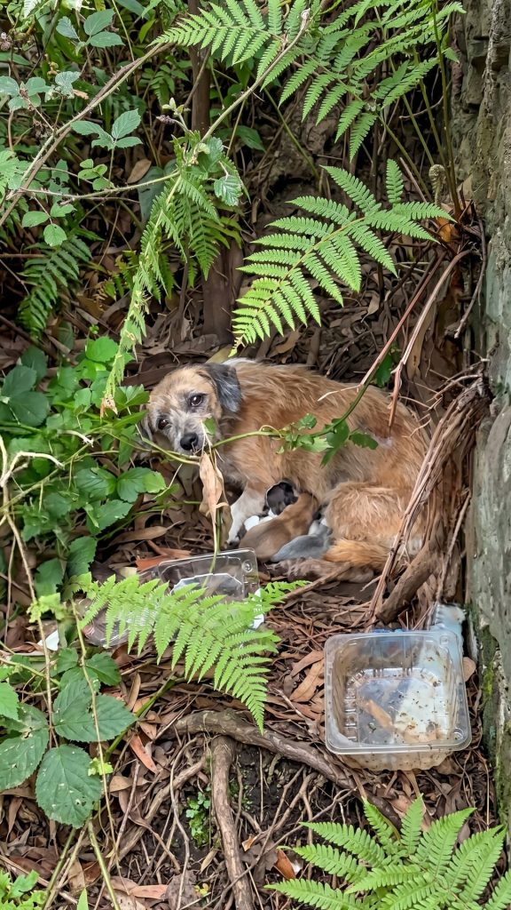 She was covered in painful wounds, her stomach unnaturally swollen, yet her only concern was the four tiny bodies desperately trying to nurse from her broken frame.