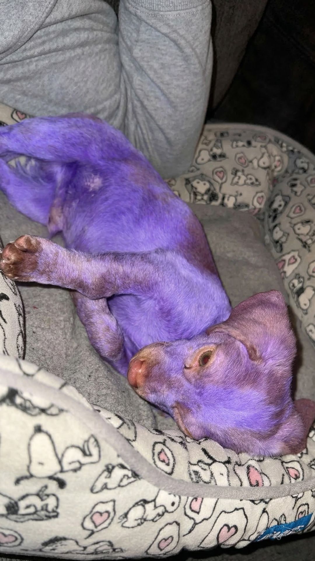 Then she looked down at a tiny, shivering dog whose short fur was entirely saturated in bright purple paint. He looked more like a discarded neon toy than a living, breathing creature who desperately needed help.