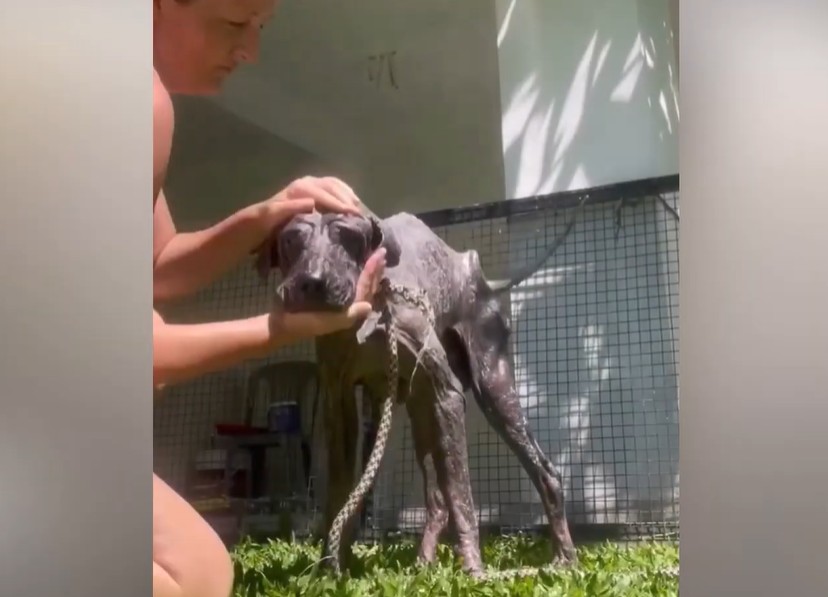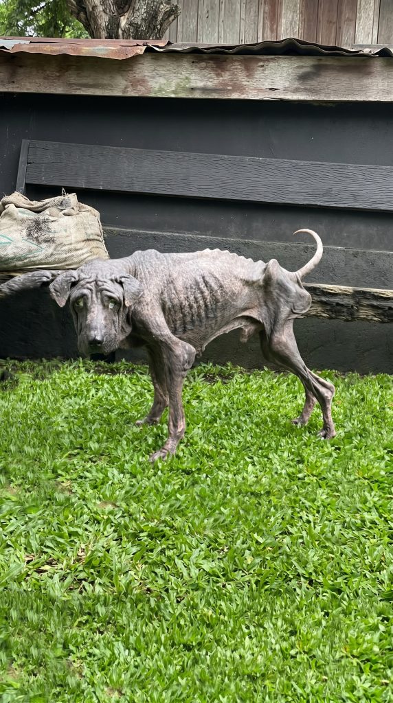 The dog, later named Walter, was emaciated to the point where every single bone jutted sharply against a mangled, leathery surface.