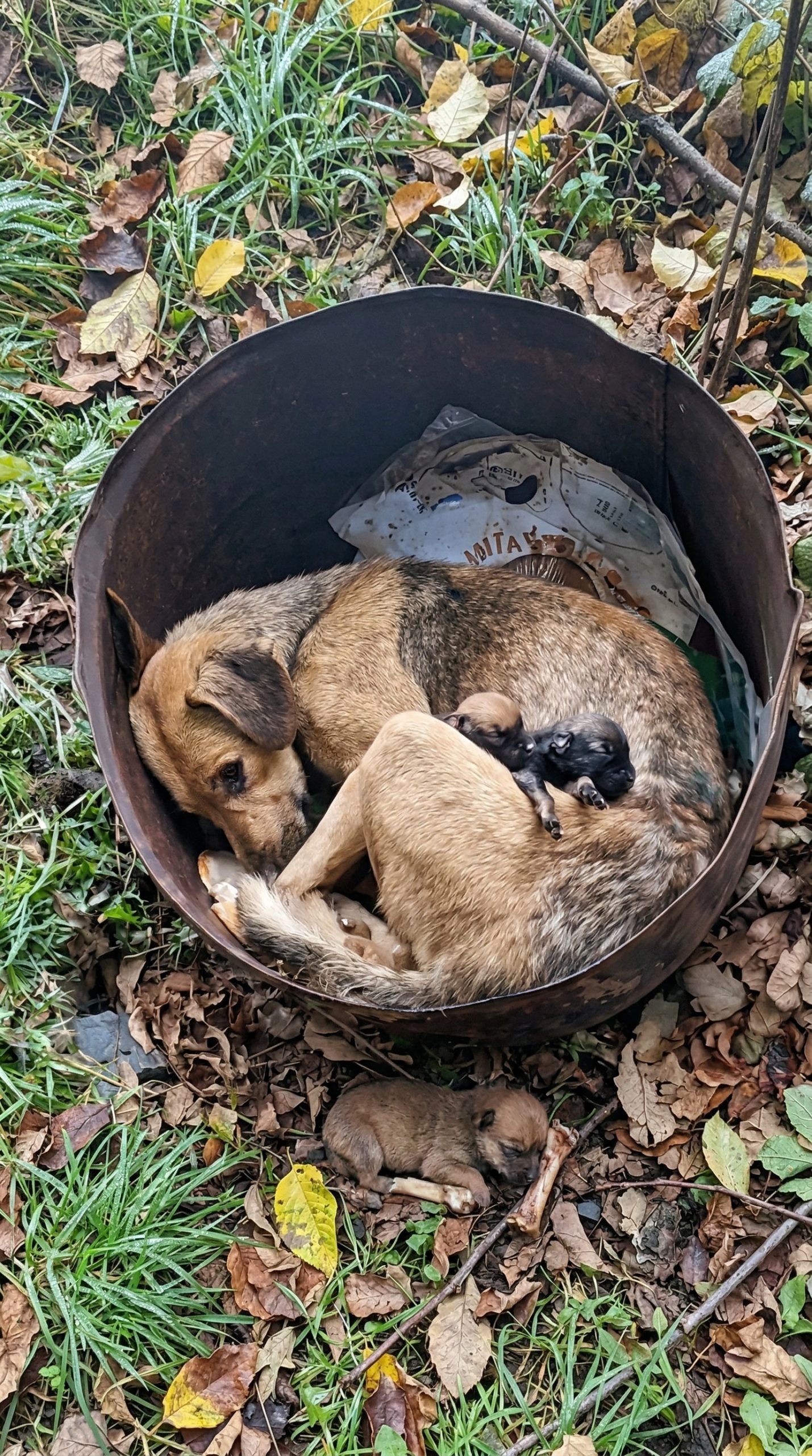 Instead of fleeing, she simply lowered her hollow face into the dirt, wrapping her front paws around the tiny bodies while letting out a shallow, defeated breath. Beside her thin frame, the heartbreaking reality of her profound isolation became clear; four of her fragile babies had already passed away in the biting cold, leaving the young mother to fiercely guard the incredibly weak breaths of those who still remained.