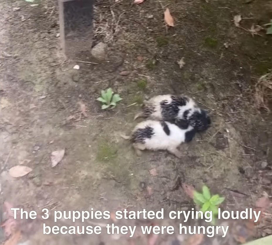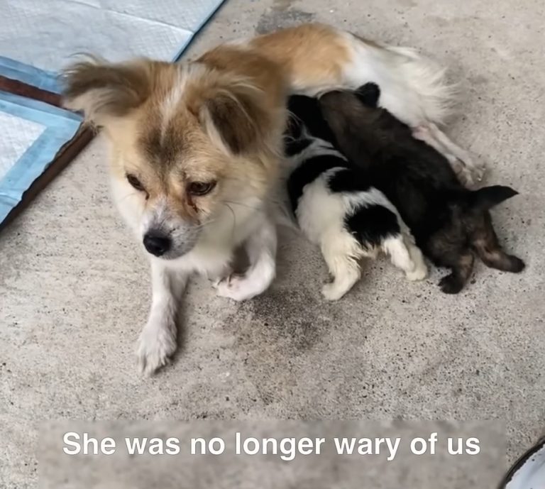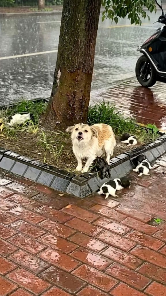 Huddled beneath a dripping tree, a soaked mother dog watched her three tiny puppies violently tremble against her cold, milkless belly.