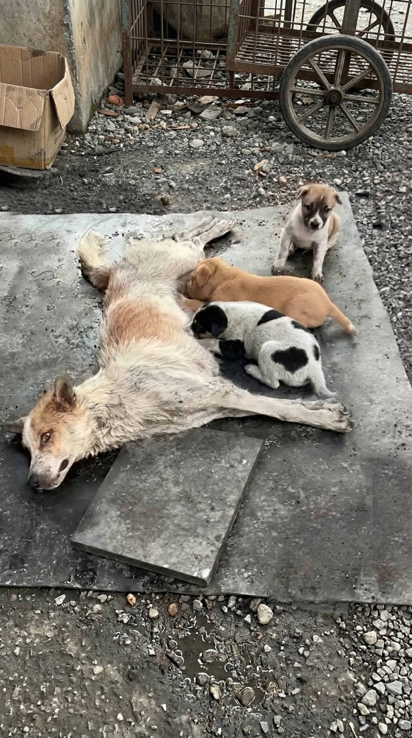 When we arrived at the abandoned edge of the noisy construction site, Saria was lying completely paralyzed in the damp, foul-smelling mud, unable to lift her head to greet us. For seven agonizing days, her broken body had served as the only source of warmth and sustenance for the seven tiny puppies frantically nursing at her stomach.