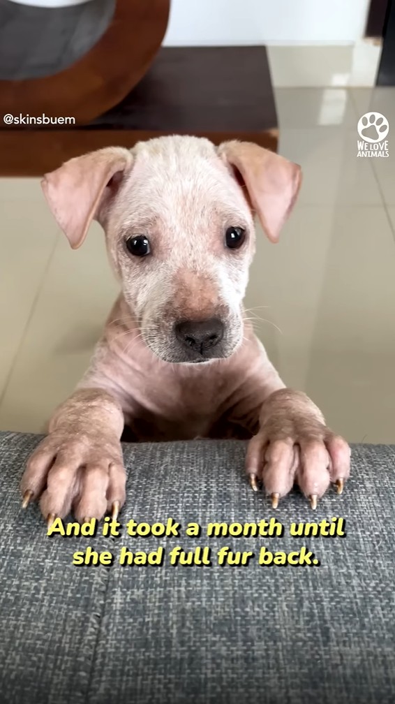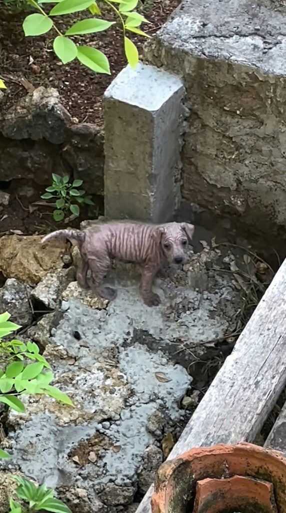 When a kindhearted person investigated the sound, they found a creature so depleted it was hard to tell she was even a puppy. She had no fur to protect her from the elements. Her tiny body was just a canvas of raw skin and deep wrinkles, shivering in the dirt.