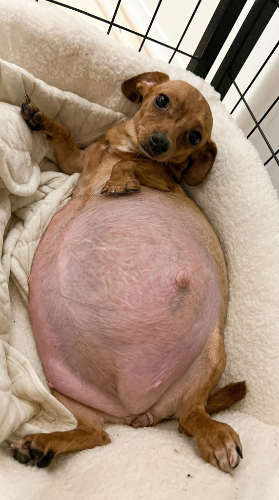Lily’s condition was dire. She weighed only 9.6 pounds, yet her swollen belly was so massive it dragged on the ground. The profound abuse she had suffered left her deeply traumatized. She huddled in the corner of the exam room, too frightened to make eye contact with the doctors.