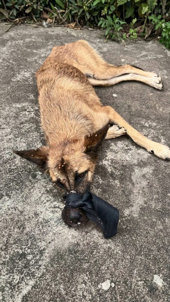 Beyond the immediate trauma of her bound muzzle, her exhausted body was completely overrun by a severe tick infestation.
