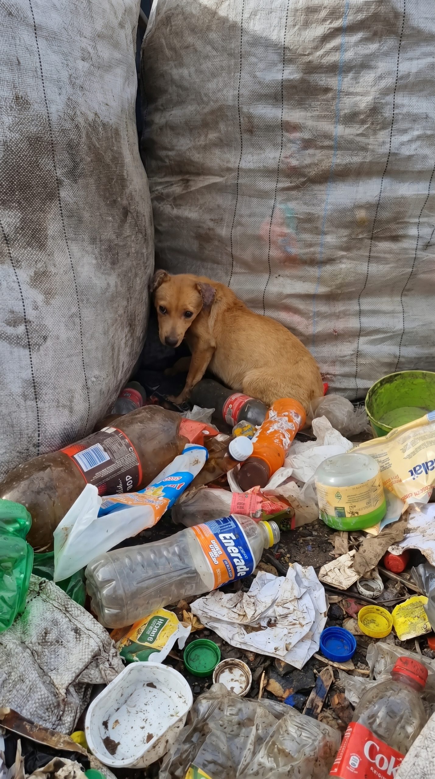 However, a warm bowl of food eventually coaxed the hungry dog out of her dark hiding spot. Slowly but surely, after finishing her very first meal, she began to softly wag her tail.