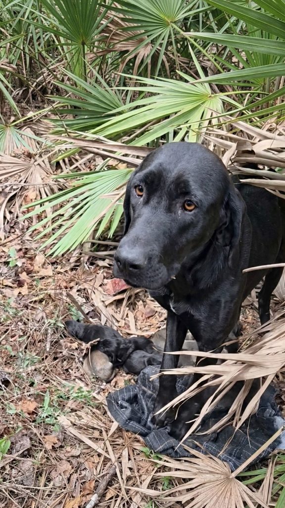 Instead of a fierce predator, they discovered a starving black Lab desperately trying to care for eleven helpless newborn puppies scattered in vulnerable piles across the dirt.