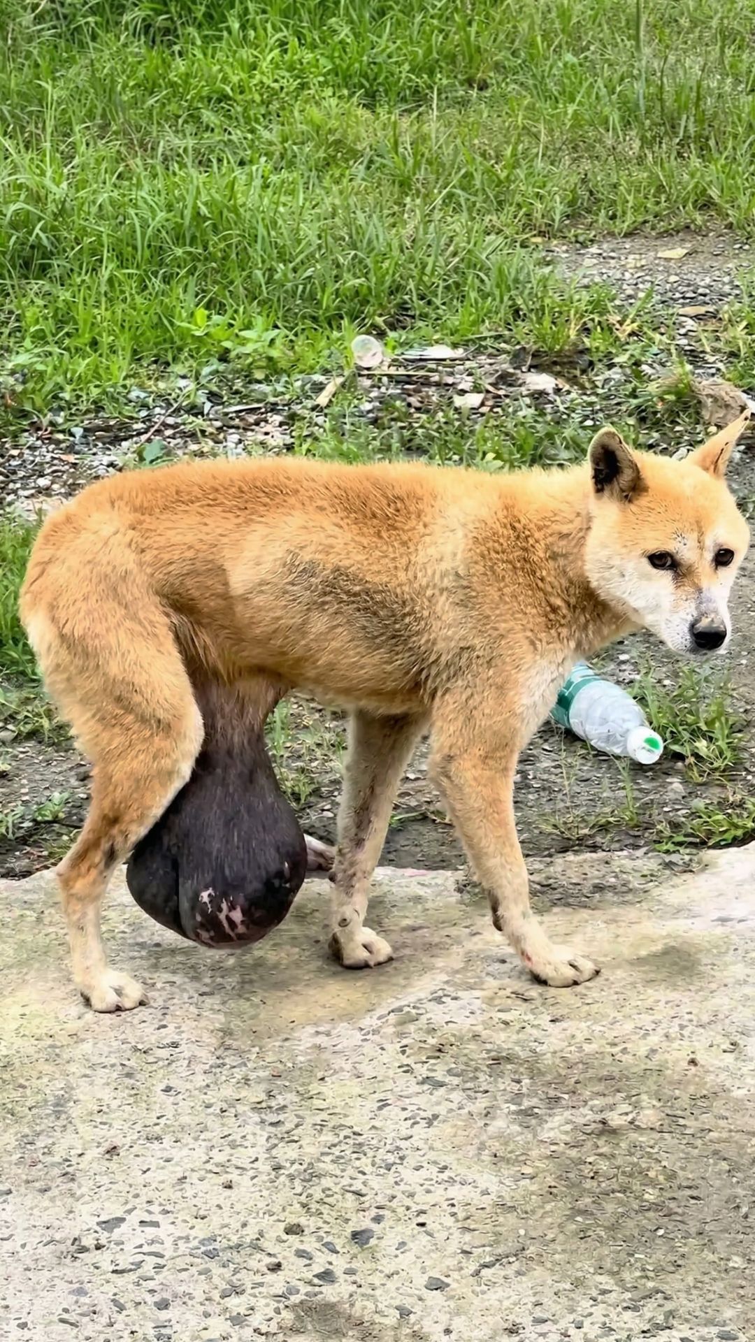 A short video on social media revealed a heartbreaking scene hidden deep within a remote mountain village. A frail dog was slowly walking away from her family, dragging a massive tumor beneath her stomach.