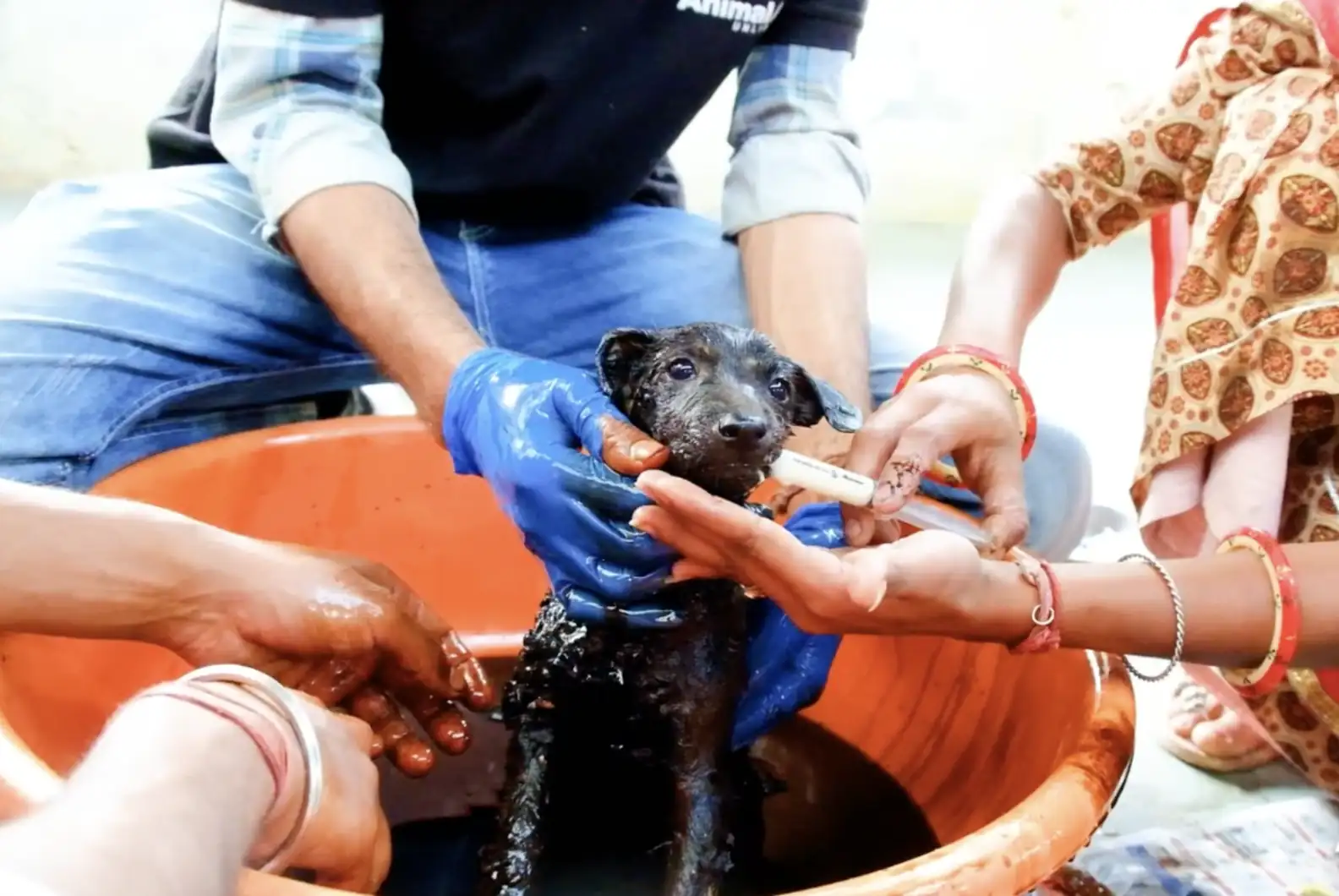 The puppies were desperately thirsty, weak, and terrified by the ordeal. The team had to pause their scrubbing every few minutes just to syringe-feed them water and keep their strength up.