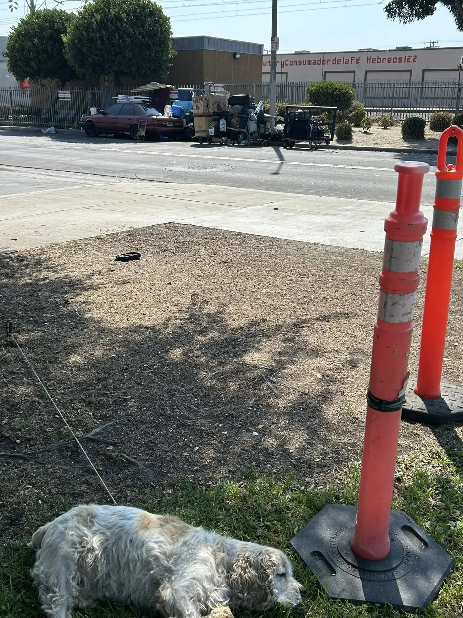 Whoever left him didn’t just walk away. They used a piece of wire and a heavy screwdriver to tether him tightly to a bright orange traffic cone. He was anchored to a single spot, completely vulnerable to the elements, unable to seek shelter or comfort.