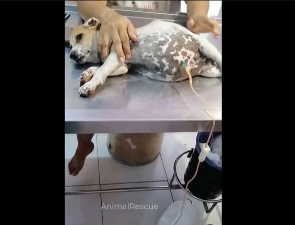 The initial medical check revealed the grim reality of her suffering. Her enormous stomach was heavily bloated with an excessive amount of trapped fluids. The situation was so severe that the fluid retention had spread, causing her delicate back legs to become heavily swollen as well.