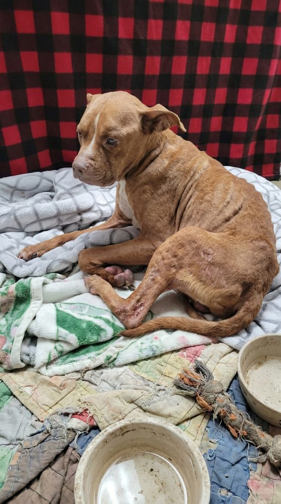 Emmy was severely emaciated. Her frail body was covered in fleas, and she bore painful pressure sores on both her elbows and knees.