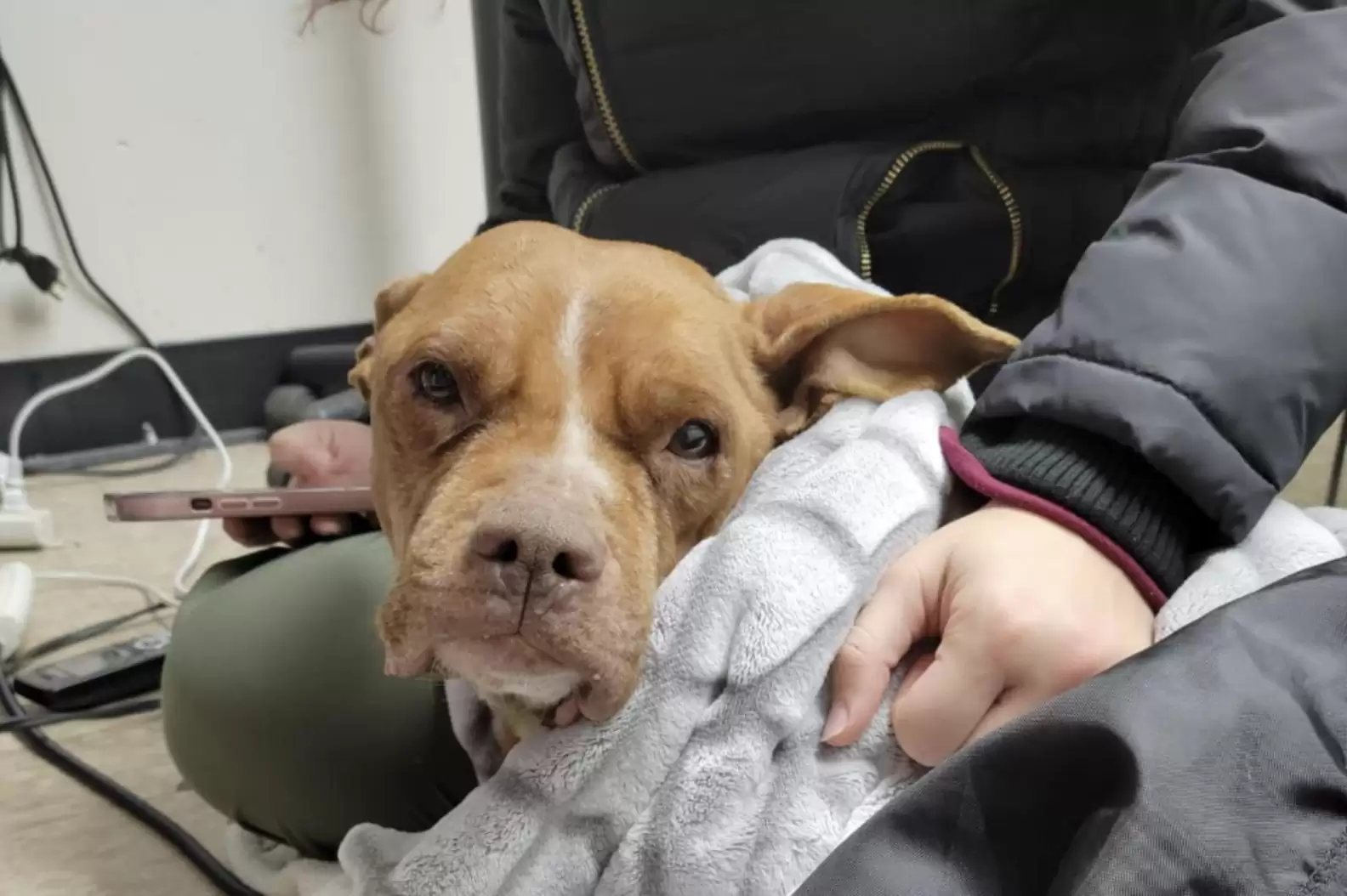 When Lauren Boesen from P.O.E.T. Animal Rescue arrived to pick her up, she was stunned by the transformation. Just 24 hours after being pulled from a snowy street, Emmy walked into the lobby with her tail wagging, crying softly for the strangers in the room to pet her.