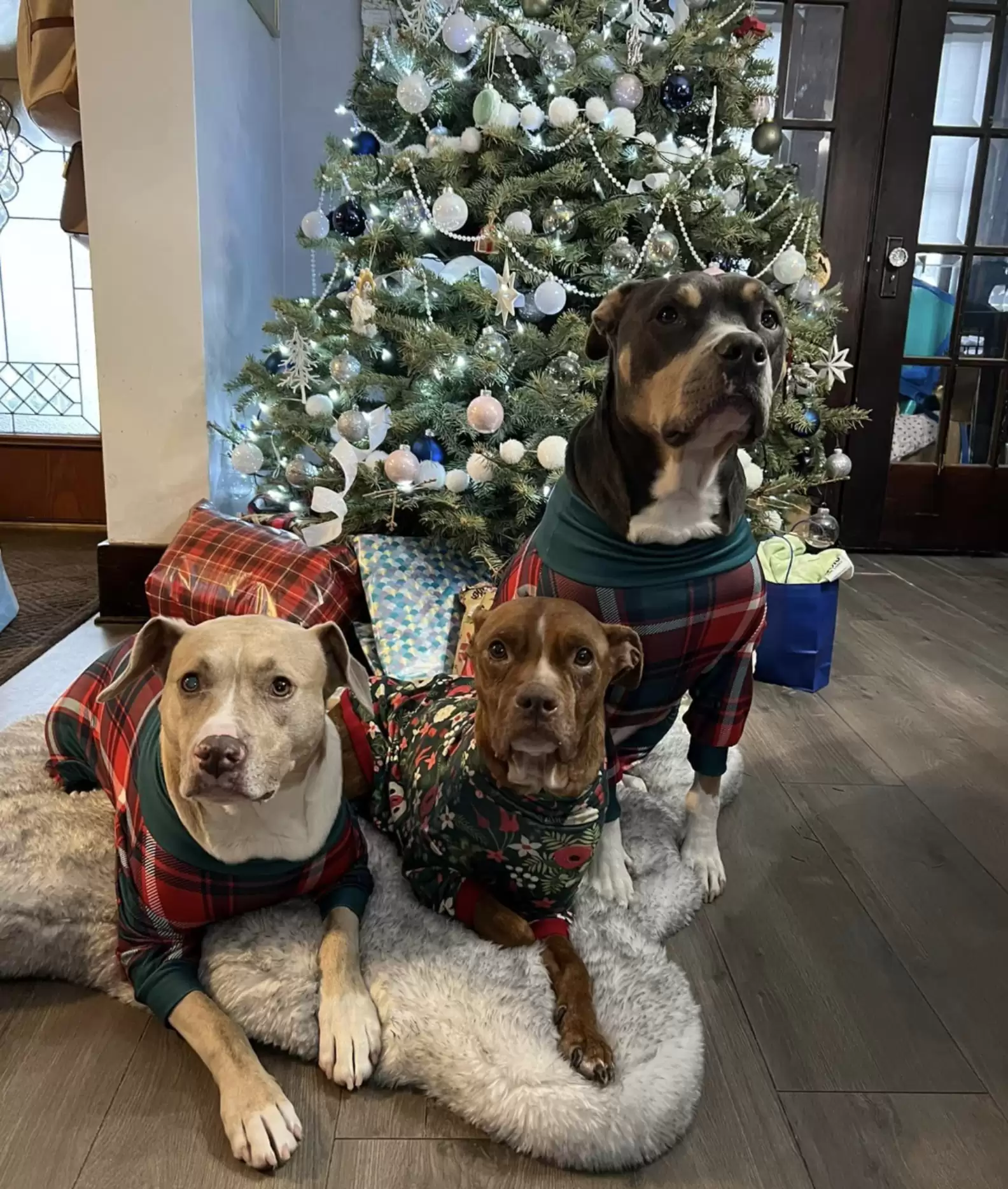 Just two days after nearly freezing to death, the resilient senior pup experienced a true miracle. She was curled up warmly underneath a Christmas tree, wearing matching holiday pajamas alongside her new foster dog siblings.
