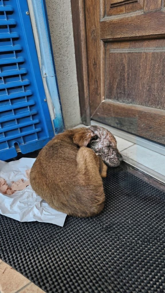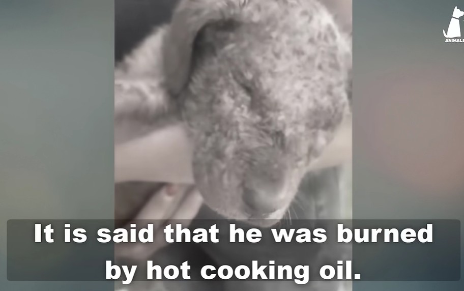 I finally spotted him huddled in a dark corner—a tiny, emaciated puppy, shivering uncontrollably while covered in ticks. His small eyes were swollen completely shut from the pain of being splashed with hot cooking oil, and his frail skin was fiercely red and irritated.