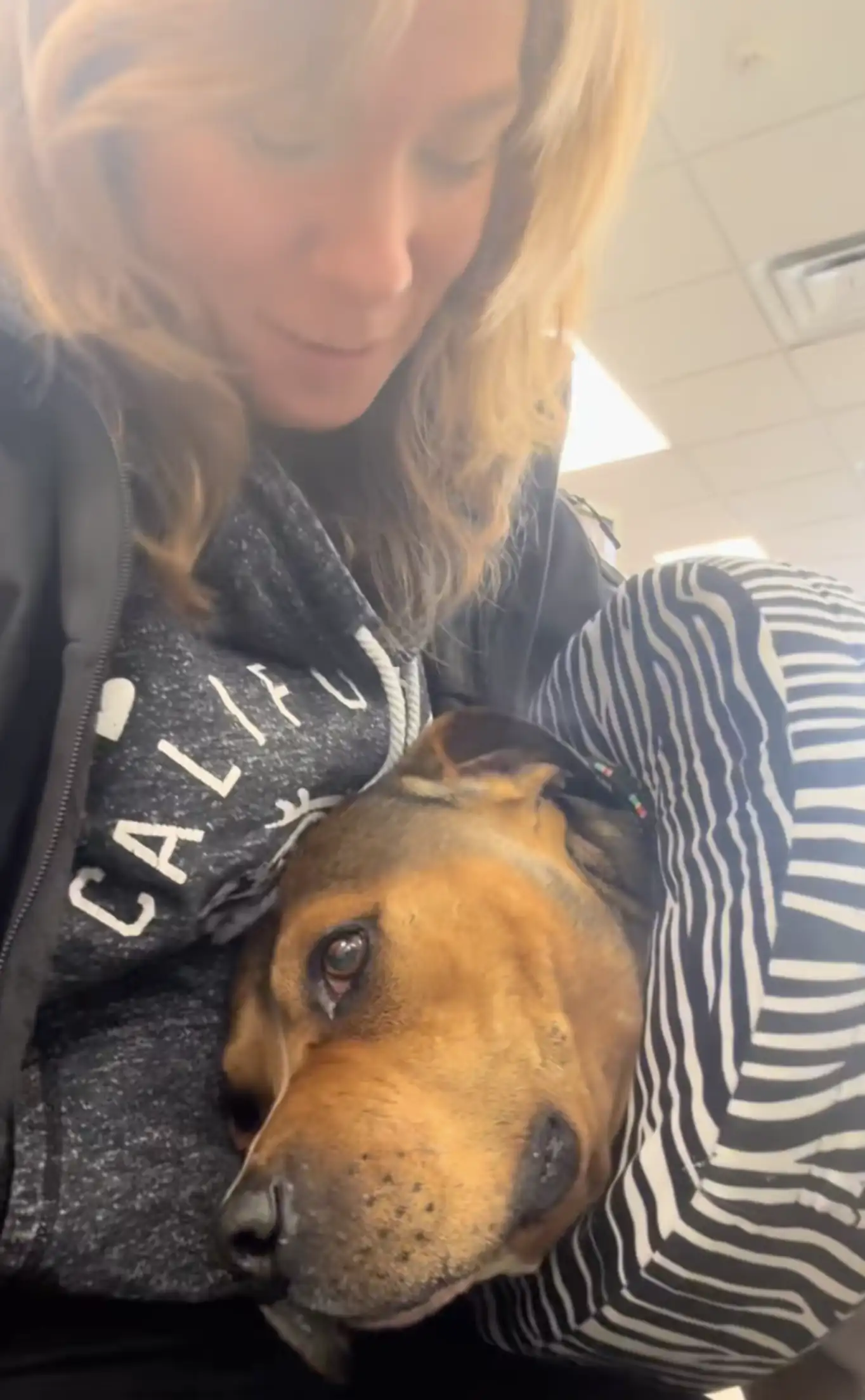 He didn’t freeze. He didn’t flinch. He walked straight up to Jordan, looked her directly in the eyes, and immediately curled his broken body right into her arms as soon as she sat down.