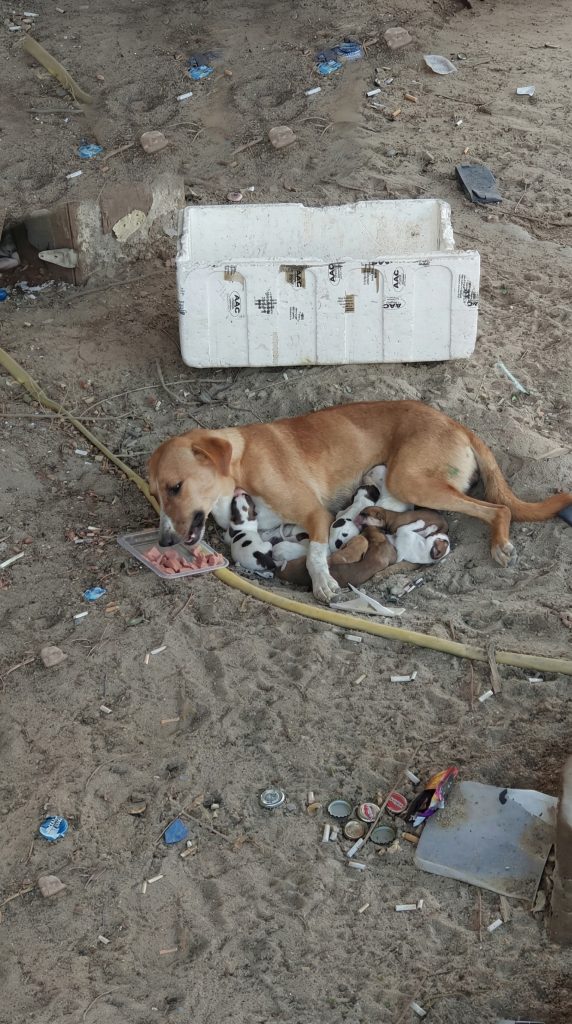 She hovered over her squirming puppies, using her own trembling shadow to give them a brief escape from the brutal sun.