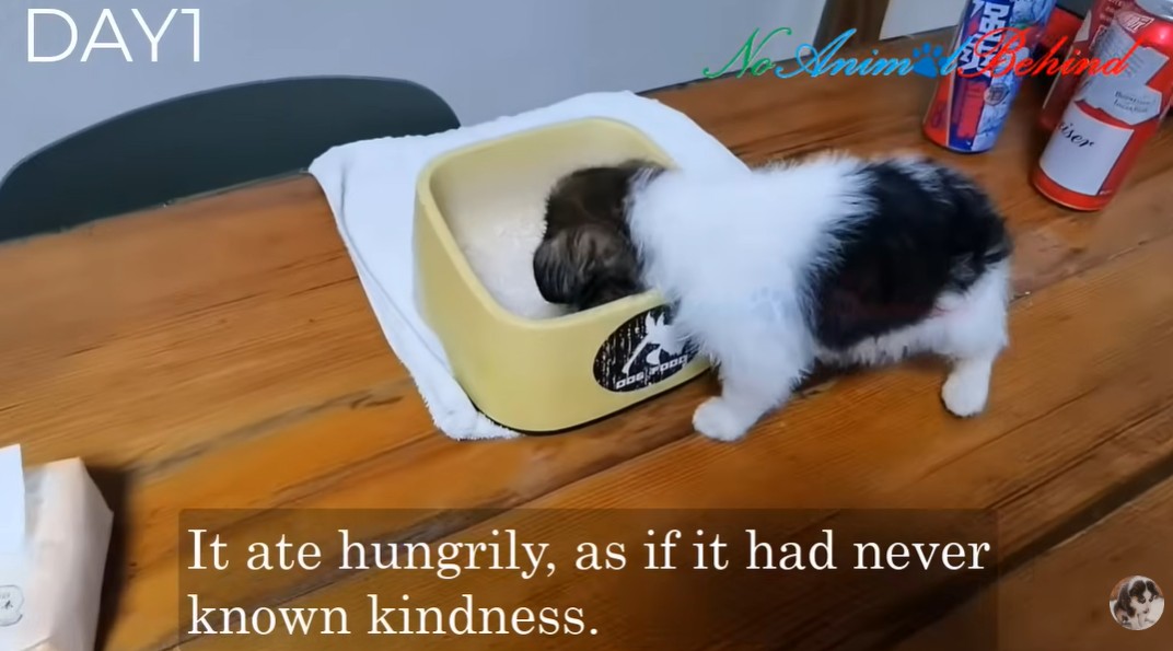When a bowl of food was placed on the floor, he ate with a desperate, frantic hunger—as if he had never experienced a gentle hand or a full stomach before. Afterward, he curled up into a tight ball, finally allowing himself to sleep.