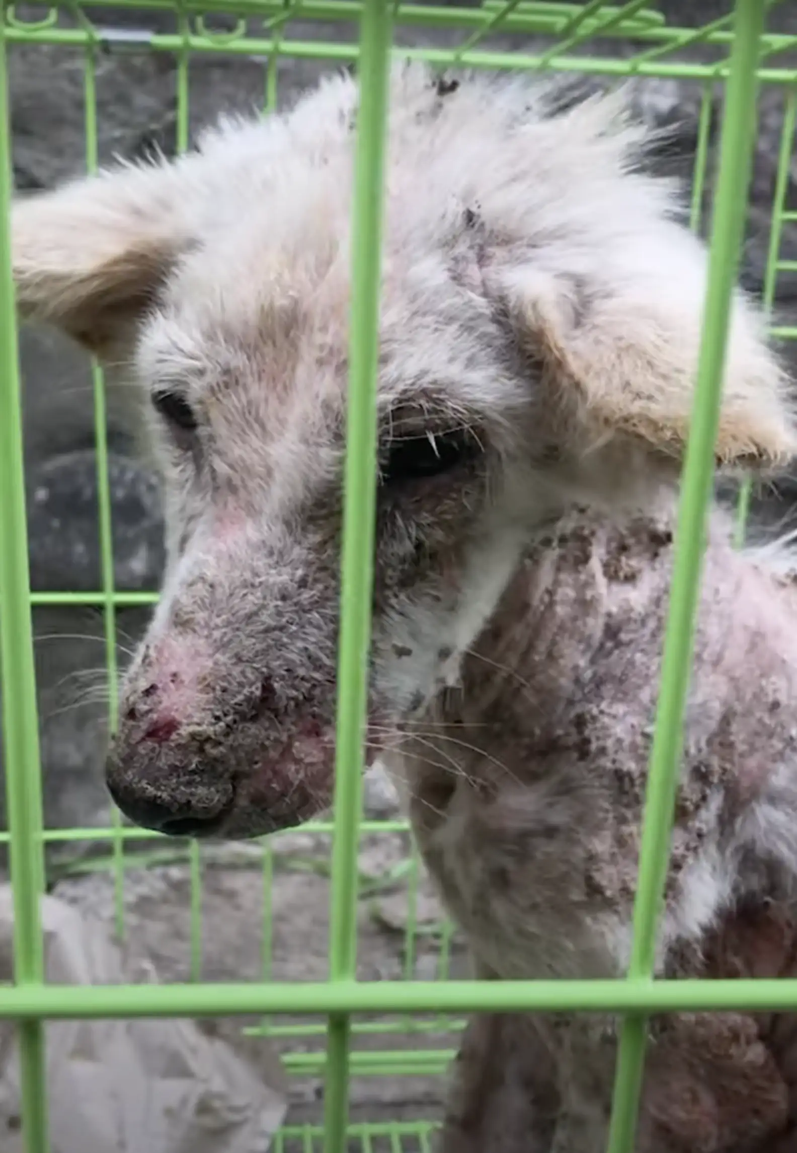 She had no fur left to protect her from the elements. Her small body was completely covered in bright red, painful-looking sores. Every movement seemed to radiate deep discomfort.