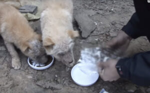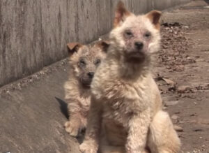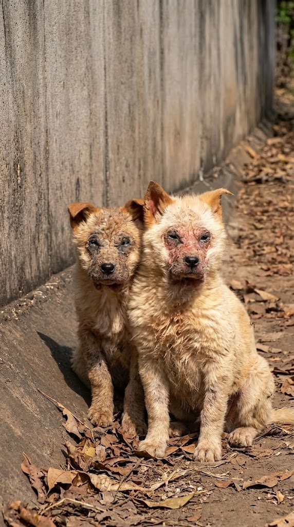 But there were no monsters hiding in the damp shadows, only two fragile puppies ravaged by a severe skin condition that had completely stripped away their fur.