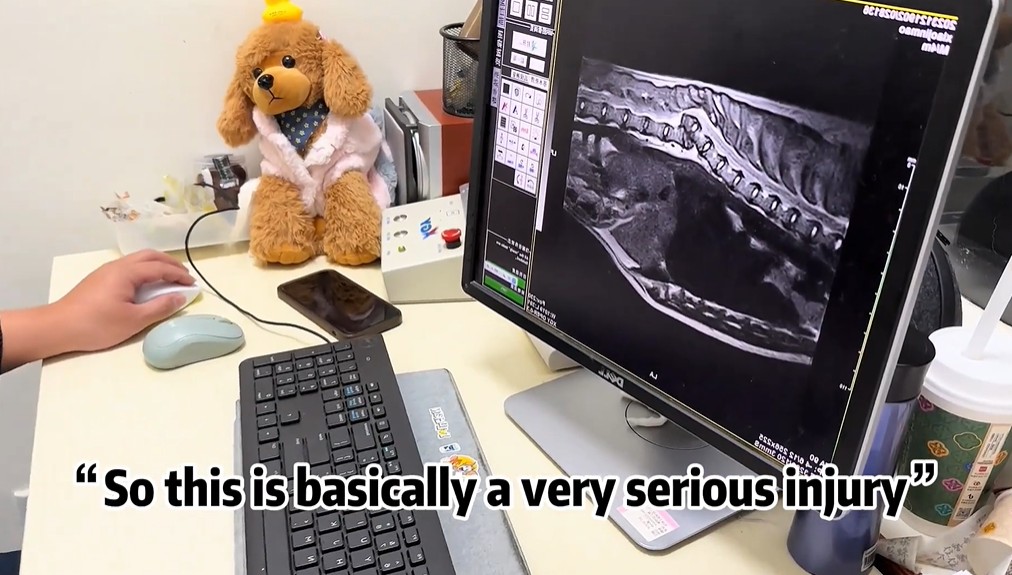 Detailed X-rays showed a severe fracture and misalignment of his thoracic vertebrae, clearly caused by a massive external force, likely a traffic accident. The nerves were inflamed, mostly severed, and experiencing bleeding. Because of the paralysis, the puppy had been dragging his legs, creating deep, painful wounds on his skin.
